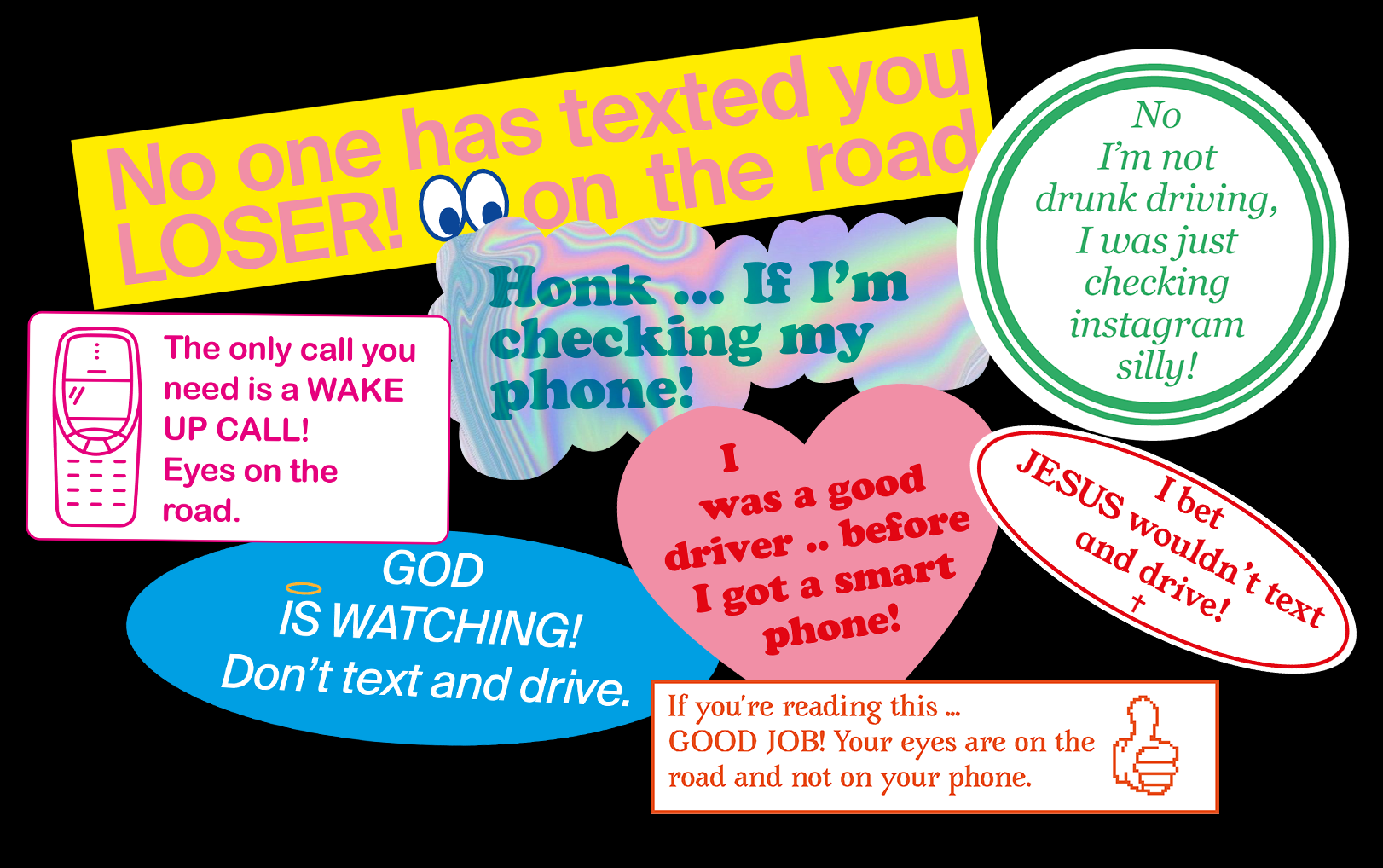 As a part of my BA thesis on technology and it's impact on humanity, I created this pack of bumper stickers about texting while driving.